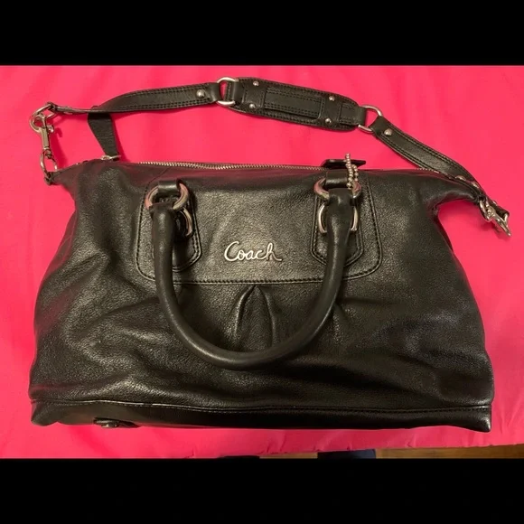 Product Name: Black leather coach purse with purple lining on sale